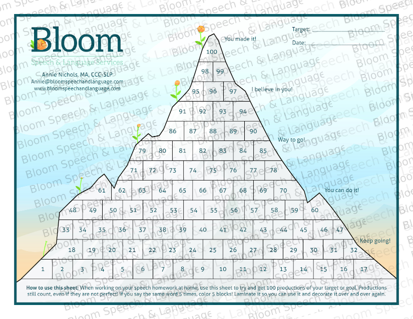 - Use the 100 block pyramid during at-home practice sessions. Encourage your child to try and get 100 productions of their goal/target each time they practice. If your child says the same word five times, that counts as five blocks! Color a number whether the production is correct or incorrect. Keep up the great work!