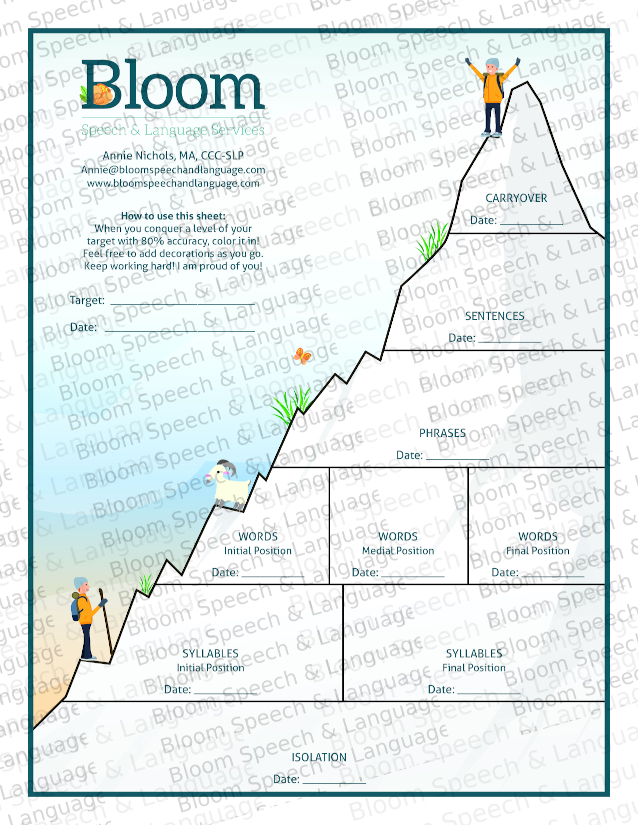 - You and your child can use the mountain to keep track of progress on his or her goals. Every time they meet a goal on their way to conquering their target sound in conversation, color it in and add mountainous decorations! This visual reminder will be so motivating!